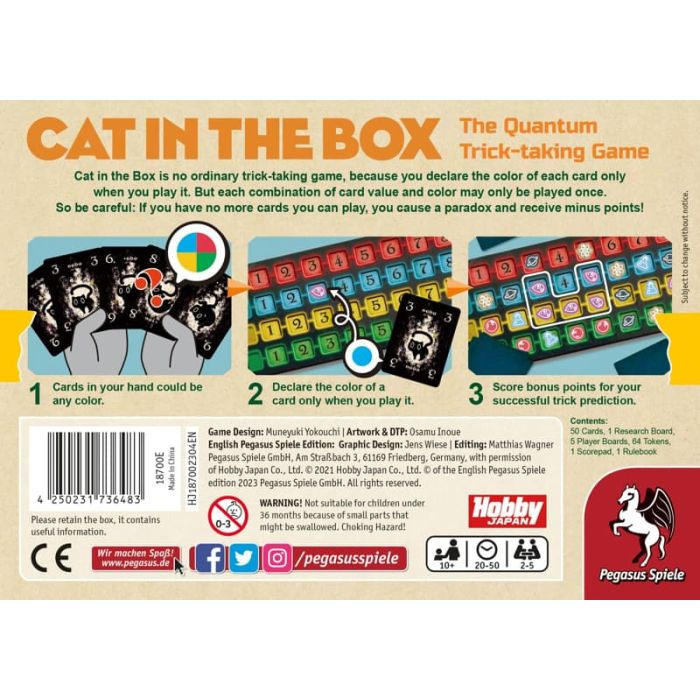 Cat in the Box è un gioco di presa di carte per 2 - 5 fantastici gatti, in cui il colore della tua carta non è definito finché non la giochi! Ipotizza quante prese vincerai e registra la tua offerta. Posiziona i gettoni sul tabellone mentre giochi la tua mano e collega grandi gruppi di gettoni per ottenere ancora più punti. Pianifica attentamente le tue prese poiché non puoi rivendicare il colore di una carta con lo stesso numero che è già stato dichiarato. Farlo sarebbe incredibilmente catastrofico poiché creeresti un paradosso!