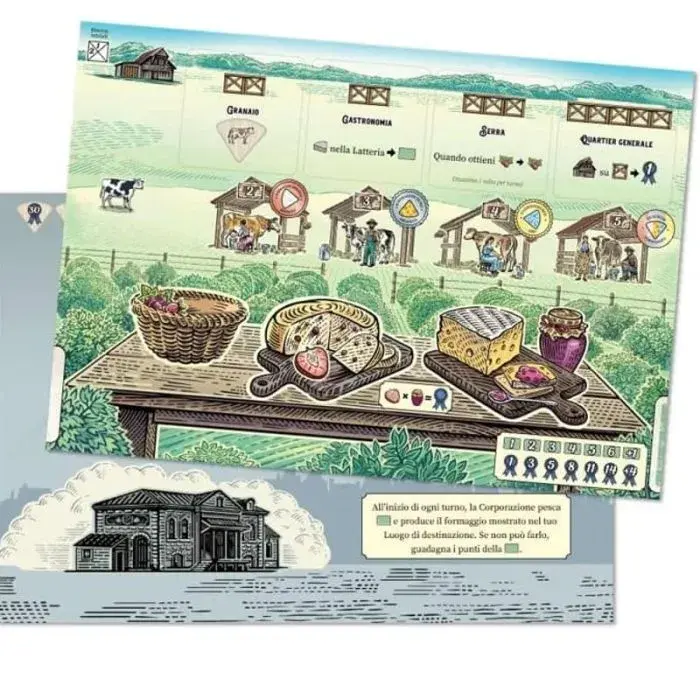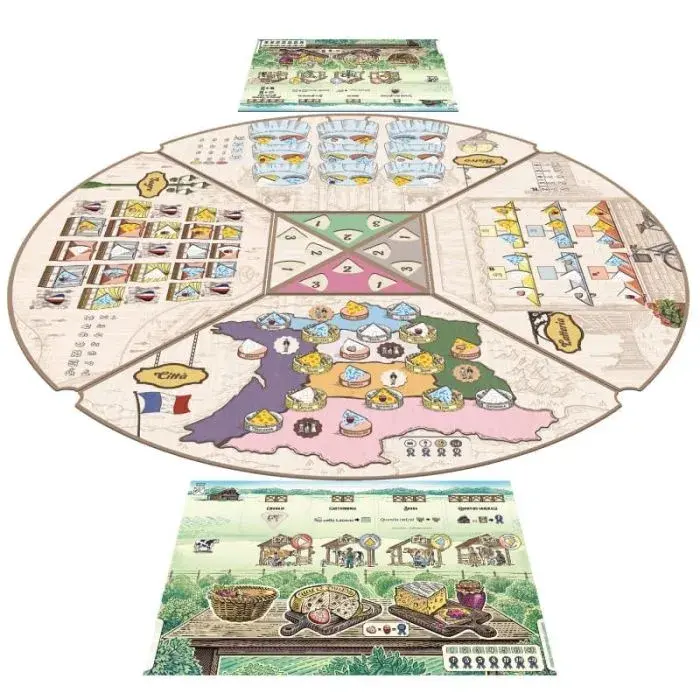 Fromage è un originale gioco di piazzamento lavoratori... su una plancia girevole! Ogni turno piazzi i tuoi lavoratori nel settore davanti a te per produrre formaggi e raccogliere risorse, poi la plancia ruota: i tuoi formaggi invecchiano e nuove azioni si sbloccano, creando un flusso di gioco strategico e coinvolgente. Ogni settore della ruota offre strategie diverse, aggiungendo varietà e sfide turno dopo turno.