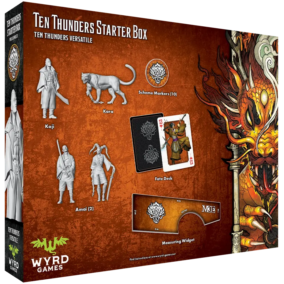 The Ten Thunders Starter Box is the perfect jumping-off point for a player ready to make the leap into Malifaux Third Edition. Containing everything needed to get started as soon as possible, this box contains four pre-assembled models, a Fate Deck, General Upgrades, Markers, and a Measuring Widget.
