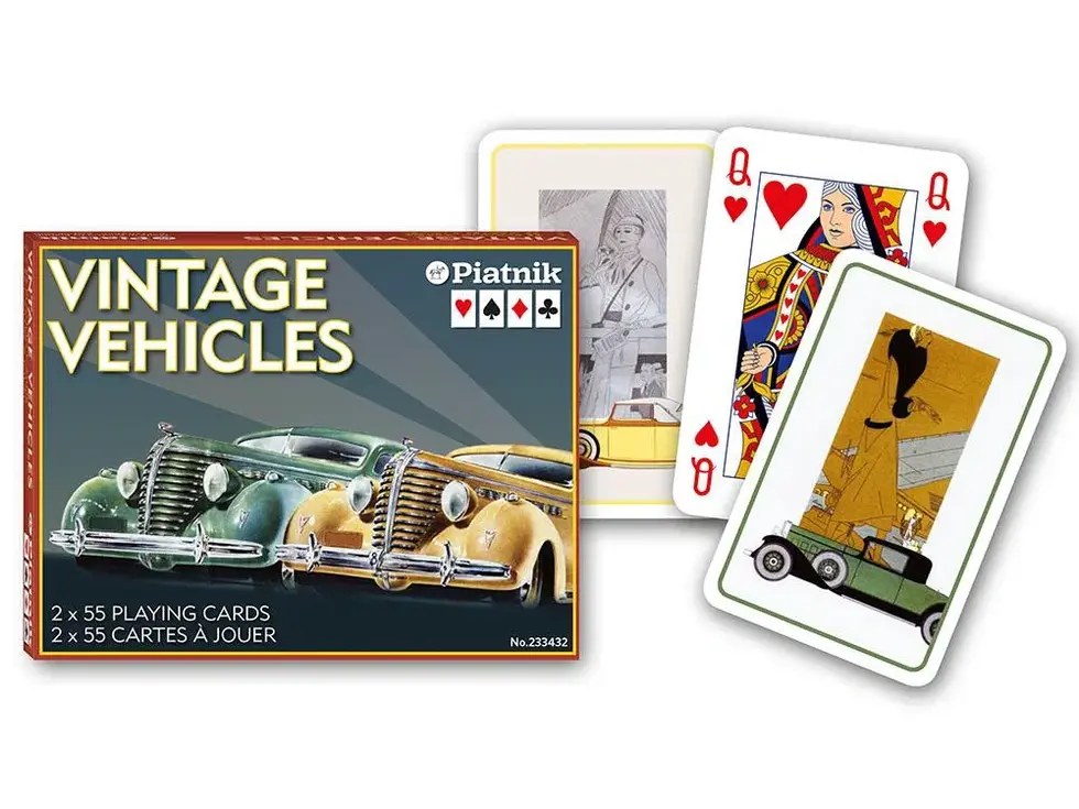 Piatnik produce carte da gioco della migliore qualità dal 1824. Il loro standard superiore rende queste carte da gioco tra le preferite sul mercato, e i mazzi doppi deluxe con i loro design artistici e decorativi, la splendida confezione e i coperchi imbottiti sono ideali per collezionisti e regali. Questo lussuoso mazzo doppio di carte da gioco mostra veicoli d'epoca dei primi del XX secolo. Queste carte sono un regalo perfetto e sono adatte per Bridge, Whist e molti altri giochi di carte tradizionali. Confezionato in una scatola astuccio in stile contemporaneo e con le dimensioni delle carte 58x89 mm, Piatnik Bridge è ideale sia per i principianti che per i giocatori esperti. Questo classico gioco di carte è per quattro giocatori in due coppie concorrenti seduti uno di fronte all'altro attorno a un tavolo. Piatnik offre la più ampia selezione di articoli di carte da gioco standard e di lusso, tutti realizzati a Vienna con materiali di altissima qualità.